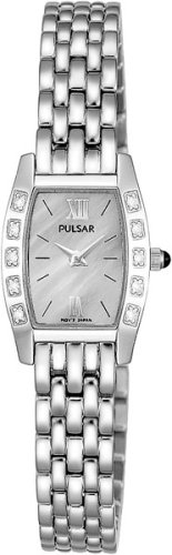 Quartz movement, Dress watch, Silver-tone hands and Roman numerals, Black indexes, Stainless steel bezel is set with 10 genuine diamonds, Stainless steel bezel, cabochon crown with black gemstone, case and caseback, Mineral crystal, 30 meters/100 feet water resistant