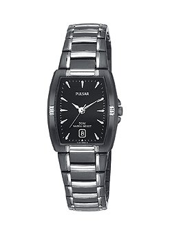 Quartz movement, Dress watch, Silver-tone hands and indices, Small white tick-markers on outer dial, Analog date display, Brushed black enamel bezel with polished silver-tone accents, Polished black enamel case and crown, Polished silver-tone stainless steel caseback, 50 meters/165 feet water resistant