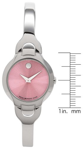 The Kara Women's Watch by Movado successfully pairs superior Swiss timepiece functionality with a flawless, feminine design. Constructed with a stainless steel case, the elegant timepiece includes a stationary stainless steel bezel and a stainless steel bracelet with a secure jewelry clasp. A durable sapphire window shields the delicate pink dial face, which features a silver-tone hour index at 12 o'clock and matching silver-tone watch hands. This beautiful Swiss-quartz-powered timepiece is water resistant to 100 feet and is backed by a two-year limited manufacturer's warranty.