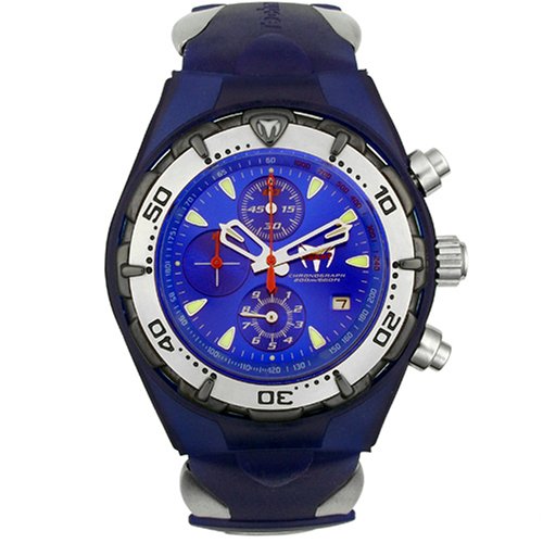 A great choice for sporty gents who like to wear their weekends on their wrists, the Technomarine Squale stainless steel chronograph features a blue gel cover to protect it from scratched during even the roughest play. The blue gel strap also includes strengthening stainless steel inserts. This large, round watch is topped by a unidirectional rotating silver bezel with black elapsed time markings. The royal blue dial features three darker blue chrono subdials (which can measure to 1/20 of a second), luminous triangular markers, oversized skeleton hands (with seconds hand), and a date window at 4 o'clock. Other features include a scratch-resistant mineral crystal and water resistance to 200 meters (660 feet)--enabling it to stand up to the rigors of recreational scuba diving.