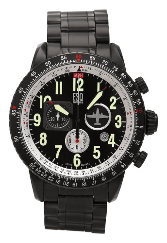 The ESQ Swiss Men's Beacon Black Pvd Bracelet Black Dial Watch #07301239 is for the sporty gentleman who appreciates style as much he appreciates function. The black, PVD bracelet is complemented by a circular bezel that has a black outer layer and a silver inner layer. The bezel complements a bold, black dial which features easy-to-read, luminous, Arabic numbers and a calendar window at four o'clock. The dial also features an aviator design with three chronograph subdials, and paddle-style, luminous hands. This watch is water resistant to 165 feet.
