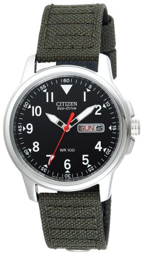 You will never run late with this men's sporty, Eco-Drive timepiece. From the stainless steel case, green canvas strap and 12/24 hour time indicator. The bold details never end. Additional features include a day/date indicator and water resistance to 100 meters.