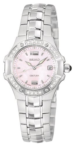 Elegant and striking, this watch features a round, pink mother-of-pearl dial with a beautiful iridescent shimmer. The silver-toned hands and markers feature environmentally-safe Lumibrite technology, which allows them to glow brightly for hours without the push of a button or from a battery. The 26-millimeter dial is set in a bezel of stainless steel accented with twenty small diamonds. The easy-to-read watch face features three-hand function, with numbers at the twelve and six o’clock positions and a date window at the three o’clock position. The bracelet-style band combines brushed and polished stainless steel adding to the versatility and secures with a fold-over push-button clasp. Other features of this watch include a sapphire crystal and a Cabochon blue stone cap on the crown. It features Japan quartz movement and is water resistance to 330 feet.