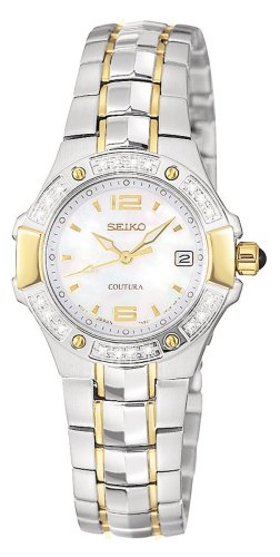Add a touch of enchantment to every precious moment with this Seiko Women's Diamond Accented Coutura Watch. This striking timepiece features a two-tone case and a matching stainless steel band that includes a steadfast fold-over-push-button clasp. Dramatic gold hour indexes, black minute indexes, and a stylized Arabic twelve and six adorn the white mother-of-pearl dial, which is encased in a sapphire window for added durability. A convenient date calendar rests at the three o'clock position. The stainless steel bezel features decorative indexes for extra readability, and a ring of glitzy diamond stones for added sparkle. Powered by quartz movement, this watch is water resistant up to 330 feet.