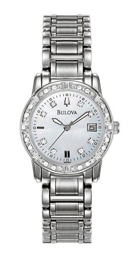The sparkling, luxurious Bulova Women's Diamond Accented Calendar Watch #96R105 showcases 24 hand-set diamonds on its stainless steel case. A white mother-of-pearl dial with luminous hands and markers, a convenient calendar window at three o'clock, a second hand, and a fashionable, stainless steel bracelet band with a deployment buckle contribute to this timepiece's unique look. Also offering a durable mineral crystal, reliable Japanese quartz movement, and water resistance to 100 feet, this watch is backed by a two-year manufacturer warranty.