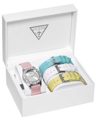 Change your watch to fit your mood! This GUESS watch comes with four interchangeable leather straps in pink, white, yellow and turquoise. Mixed metal round case. Swarovski crystal-accented bezel. Silvertone dial with stick indices, logo and numerals. Quartz movement. Water resistant to 50 meters. Ten-year limited warranty.