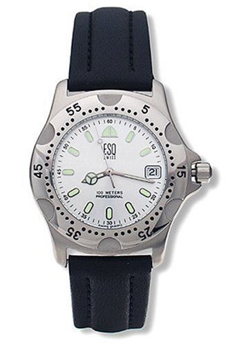 High end styling and solid performance characterize this rugged sport watch from ESQ. The midsized brushed steel case frames a silver dial with bold luminous hands and markers for nighttime visibility. Other notable details on the dial include a Mercedes-style hour hand, small Arabic minute indicators, and a convenient date display. The dial is capped with a virtually scratch-proof sapphire crystal and framed by a rotating steel bezel for recording elapsed time. A black leather strap with topstitch detailing completes the look. A handsome profile for both casual and business wear, this ESQ watch offers Swiss quartz precision and is rated water resistant to 100 meters.