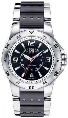 From ESQ's Antero collection comes this dynamic profile in brushed and polished stainless steel. The black dial is designed for easy read off, even in the dark, with luminous hands, a red sweep seconds hand, and luminous italicized numerals and hour markers. Minute indexes frame both the inner and outer dials, and a distinctive arched window at the six o'clock mark displays the date. The dial is capped with a scratch-resistant flat mineral crystal and framed by a unidirectional rotating ratcheted steel bezel for recording elapsed time. A gear-style logo crown accents the 43mm case, and a robust steel and black PVD bracelet, detailed with perforated accents, completes the look. This ESQ watch boasts Swiss quartz precision and water resistance to 100 meters.