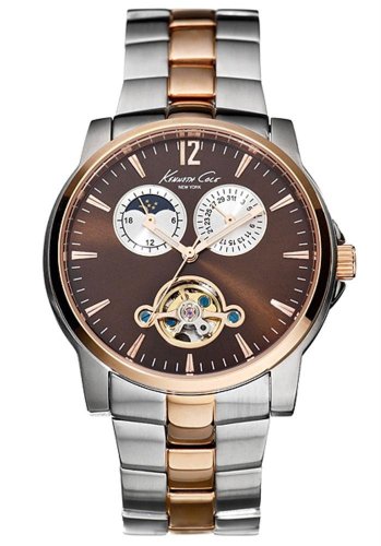 The Kenneth Cole men's automatic watch is an exquisitely detailed, magnetic timepiece that offers incredible beauty and usefulness to the wearer. It features a round brown dial, protected by a mineral crystal and set in a 42-millimeter stainless steel case with gold-tone bezel. The dial includes large, gold-tone indexes, an Arabic numeral at the 12 o'clock position for reference, and two small, round sub-dials for date and 24-hour tracking. The most fascinating element of this watch is the partially revealed automatic movement, compellingly visible behind a small round cut-out at the bottom of the dial. This stellar watch is finished with a 22-millimeter stainless steel, bracelet-style band with a gold-tone center and a pushbutton clasp. The watch is water resistant to 98 feet.