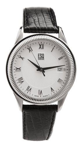 The ESQ Swiss Men's Harrison Black Lizard Grained LESQ Swiss Men's Harrison Black Lizard Grained Leather Strap Silver Dial Watch is a truly elegant timepiece with a sense of enduring style. Protected by a fine mineral crystal, the round, silver dial is distinctively embellished with rich black, Roman hourly indexes framed by delicate stick second indication at the outer dial and adjoined by a convenient date window at the three o'clock. The tastefully bordered inner dial flaunts sharp, silver-tone hour and minute hands. The sophisticated, silver-tone bezel of this lovely timepiece is held by a case forged from fine quality stainless steel, while the distinguished bands are a black Teju-embossed, lizard grained leather. This watch is made for the wardrobe of the classically stylish gentleman.
