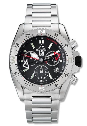 The men's Sqadron watch from ESQ is designed for the outdoors adventurer. This stainless-steel timepiece features a black dial with mountain design, white luminous hour and minute hands and thin red second hand. The bezel doubles as a compass for your next trek and also features black engraved degree markers. A date calendar sits at the four o'clock. This precision Swiss-quartz movement timepiece embodies the man who appreciates performance and adventure.
