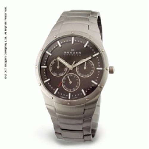 A great match to your contemporary business couture, this Skagen titanium men's watch features a thin profile that's just 9mm thick (0.35 inches) and feather-light weight. The case and bracelet are made from solid titanium, which is nearly 50 percent lighter than steel, but 30 percent stronger. It's also particularly resistant to salt water corrosion, as well as hypo-allergenic--perfect for those with metal allergies. The black dial face offers three subdials--day of the week, date, and second time zone--as well as super luminous stick markers and hands (with seconds hand), and small minute indexes. Other features include Japanese quartz movement, a scratch-resistant super-hardened mineral crystal, and water resistance to 100 meters (330 feet)--offering protection from accidental splashes as well suitable for swimming, snorkeling, and light recreational diving.