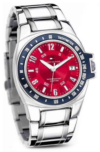Add a classic timepiece to your collection with Tommy Hilfiger's Riverside stainless steel men's watch, which adds its own stylishly contemporary twist. It features a large, round silver stainless steel watch case with a highly polished finish and a bezel with a tachymeter readout in blue. It frames a shimmery red dial background that also includes a mix of silver stick and Arabic numeral markers, large luminous hands (with seconds hand), and a date display at 3 o'clock. The silver stainless steel bracelet band flows seamlessly from the case and offers a mix of brushed and polished surfaces. Other features include water resistance to 50 meters (165 feet), scratch-resistant mineral crystal, and precise Japanese quartz movement.