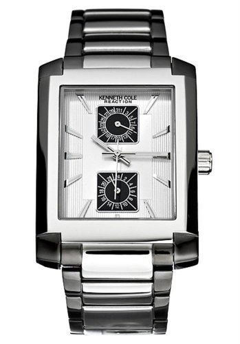 The slim, elegant bracelet watch from Kenneth Cole is a fine timepiece with fashionable details that will wear well from day to night. The rectangular face is what gives this analog-quartz-powered watch its slender silhouette. It also features a bright, silver-white dial with silver indexes and three-hand movement. Two sub-dials sit below the 12 o'clock position and above the six o'clock position for added functionality. A mineral crystal protects the dial contents, and for an extra touch of style the corners of the 32-millimeter stainless steel case are finished with hematite. This watch is secured with a 22-millimeter bracelet-style, stainless steel band, outlined in a muted copper tone and finished with a pushbutton clasp. This watch is water resistant to 100 feet.