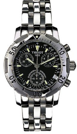 Classically fashionable and ruggedly masculine, the Tissot PRS200 stainless steel men's watch features ultra-precise Swiss chronograph timing features. It enables you to time events up to 30 minutes, displaying results to 1/10th of a second, and it offers standard start/stop functionality as well as split (intermediate) and add (partial) functions. The large, round silver stainless steel watch case measures 40mm (1.6 inches) wide and 11mm (0.45 inches) thick. It's topped by a unidirectional rotating bezel with black engraved elapsed time markings and brushed riders.