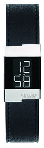 This bold, modern profile, from Kenneth Cole's Reaction line, features a square black dial with an extra-large vertical digital display. The watch offers both an hours and minutes display and a date function and is presented in a geometrically-styled stainless steel case. The smooth black leather strap matches the case in width, creating a streamlined look that's sleek and contemporary.