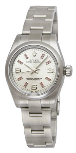 Rolex Lady Oyster Perpetual Watches (updated design - launched May 2007). 26mm brushed stainless steel case, polished domed bezel, silver dial, Arabic numerals and blue sticks, and brushed stainless steel Oyster bracelet.