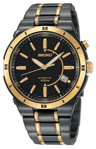 This Men’s watch with Black Ion Finish and gleaming gold tone highlights makes for rich contrast in this Seiko watch. By the simple movement of your wrist, the rechargable battery charges itself. Once fully charged, it captures and stores energy up to six months. Kinetic – the most advanced electronic watch technology. Environmentally friendly. Features in a black dial accented by the gold hands and markers and the power reserve indicator. 100 meters water resistant.