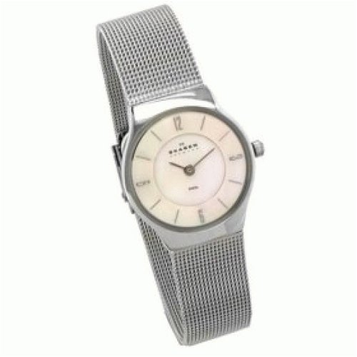 Add a touch of class to any ensemble with clean, simple lines of this mid-sized Skagen stainless steel women's watch, featuring a unique mesh bracelet and mother-of-pearl dial face. This silver stainless steel watch case measures 25mm (1 inch) wide and is topped by a brilliantly polished bezel. The shimmery mother-of-pearl dial features a mix of silver stick and Arabic numeral marker, and thin baton hands. The easily adjustable silver mesh stainless steel bracelet band adds an elegant texture, and it's joined by a fold-over safety clasp. Other features include a scratch-resistant mineral crystal, precise Japanese quartz movement, and water resistance to 30 meters (100 feet)--which can withstand splashes of water while washing hands or in the rain.