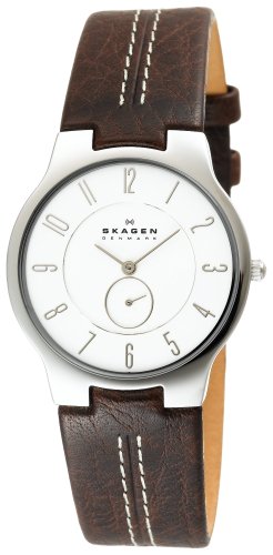 The Skagen men's slim brown leather watch looks sharp on the arm of rugged outdoorsy adventurers. This timepiece is constructed with a 36-millimeter stainless steel band, a stainless steel bezel, and a soft brown leather band with white contrast stitching and a comfortable buckle clasp. A durable mineral dial window protects the white dial face, which features silver-tone Arabic numerals and matching silver-tone hour and minute hands. A smaller circle above six o'clock features a silver-tone second hand for an elegant appearance. In addition, this quartz-movement-powered watch is water resistant to 100 feet, making it the perfect accessory for a hike in the woods or a weekend fishing trip.