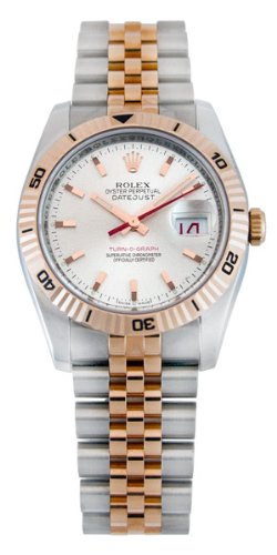 Stainless steel case. 18kt pink gold and steel Jubilee bracelet. 18kt pink gold fluted rotating bezel. "Turn-O-Graph" model. White dial with stick hour markers. 36mm, Synthetic sapphire crystal. 31 Jewel Chronometer Automatic Date displays at 3 o'clock position. Rolex Model Number 116261.